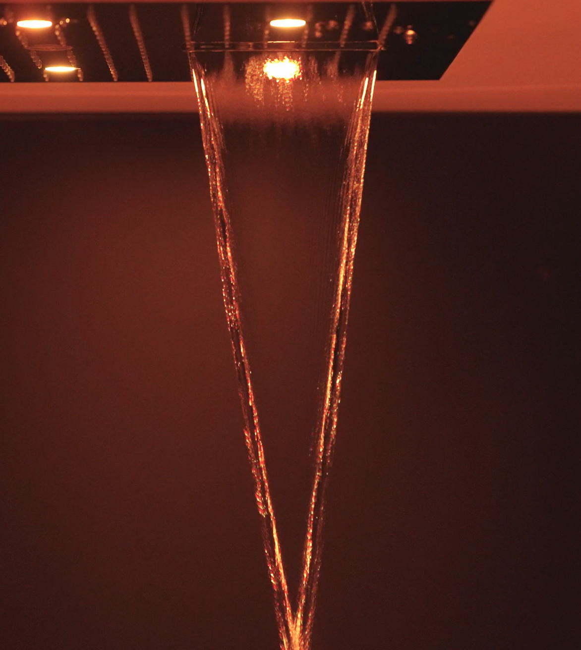 A concentrated beam of light within the water jet provides an intense and targeted sensory experience, combining chromatic and hydric stimulation in a single regenerating flow.